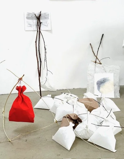 With a more confident sense of direction, I turned to the materials around me. For my palette I experimented with making inks from coffee and seasonal blackberries. I gathered willow and hazel sticks for drawing and building small, playful 3D structures. These foraged resources tied my practice to the landscape itself, deepening the sense of place.
