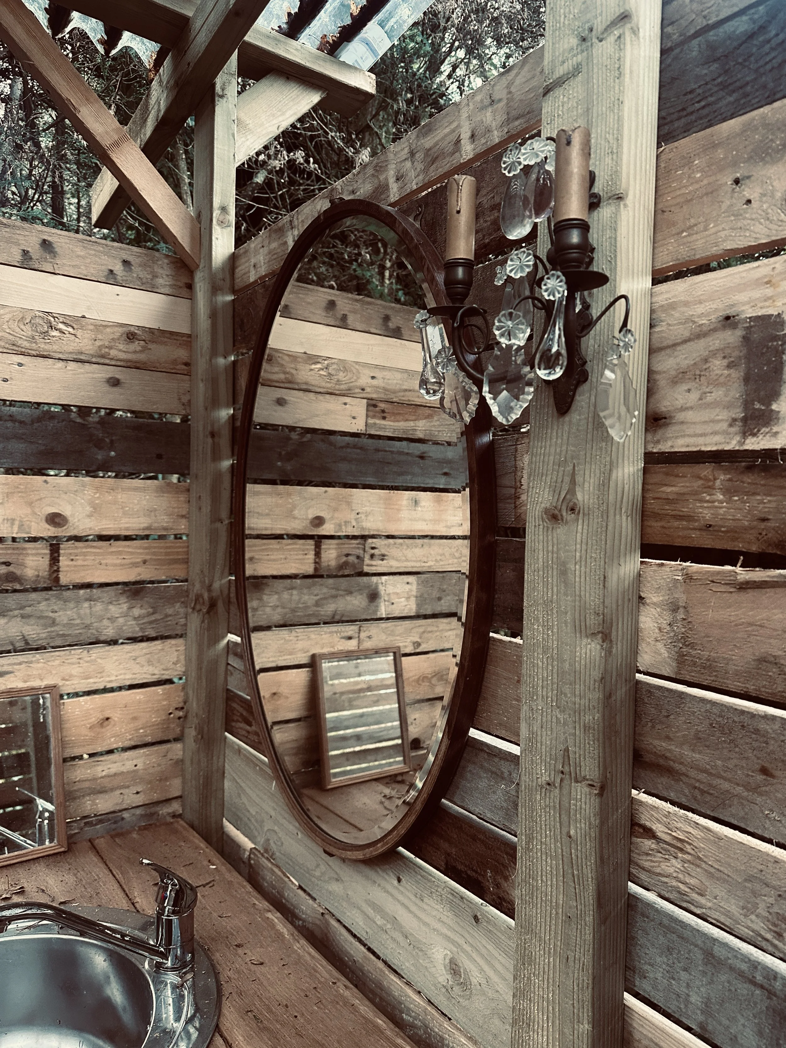 Your rustic outdoor style shower room and kitchen are next to your hut.